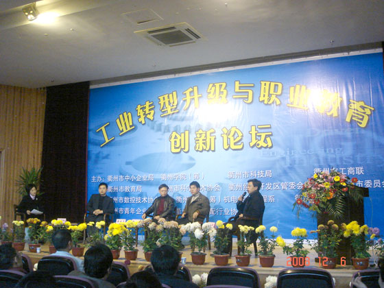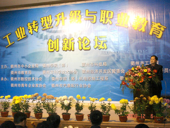 12月6日,由衢州市中小企业局、浙江工业大学浙西分校、衢州市科技局、衢州市科学技术协会、衢州市教育局等单位主办,浙工大浙西分校机电控制工程系等单位承办的“工业转型升级与职业教育创新论坛”,在我校老图书馆1号报告厅隆重举行。 出席本次论坛的特邀嘉宾有浙江大学博士生导师傅建中教授,浙江师范大学企业管理专家郑文哲教授,浙江省教育厅职成教处陈达副处长,武汉华中数控股份有限公司总经理向华博士。衢州市中小企业局、衢州市科技局、衢州市科学技术协会、衢州市教育局、衢州市经济开发区管委会、衢州市工商联、共青团衢州市委员会等单位领导以及来自全市中小企业的企业家们、职业院校的教师和我校机电系学生200余人参加。 本次论坛就当今世界金融危机的影响,国内经济形势严峻的情况下,工业如何转型升级,企业如何度过寒冬,职业教育如何创新来为工业的转型升级服务等备受人们关注的问题,专家作了精彩的报告和探讨。