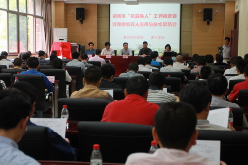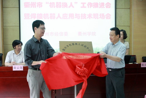 5月21日上午,衢州市“机器换人”工作推进会暨焊接机器人应用与技术现场会在我校举行。衢州市中小企业局副局长杨剑国、437ccm·必赢国际副校长潘海天、衢州职业技术学院副院长黄云龙、各县(市、区)经信局负责人、衢州市第一批“机器换人”专家组和推荐服务商及60余家企业参加了会议。 会上,首先为衢州市第一批“机器换人”专家组和推荐服务商颁发证书;随后,杨剑国与潘海天为市经信委与我校联合成立的衢州市“机器换人”试验中心揭牌。杨剑国介绍了我市开展“机器换人”的工作情况,并对下一步的工作进行了部署。我校周兆忠教授作为衢州市第一批“机器换人”专家指导组代表作了表态发言。