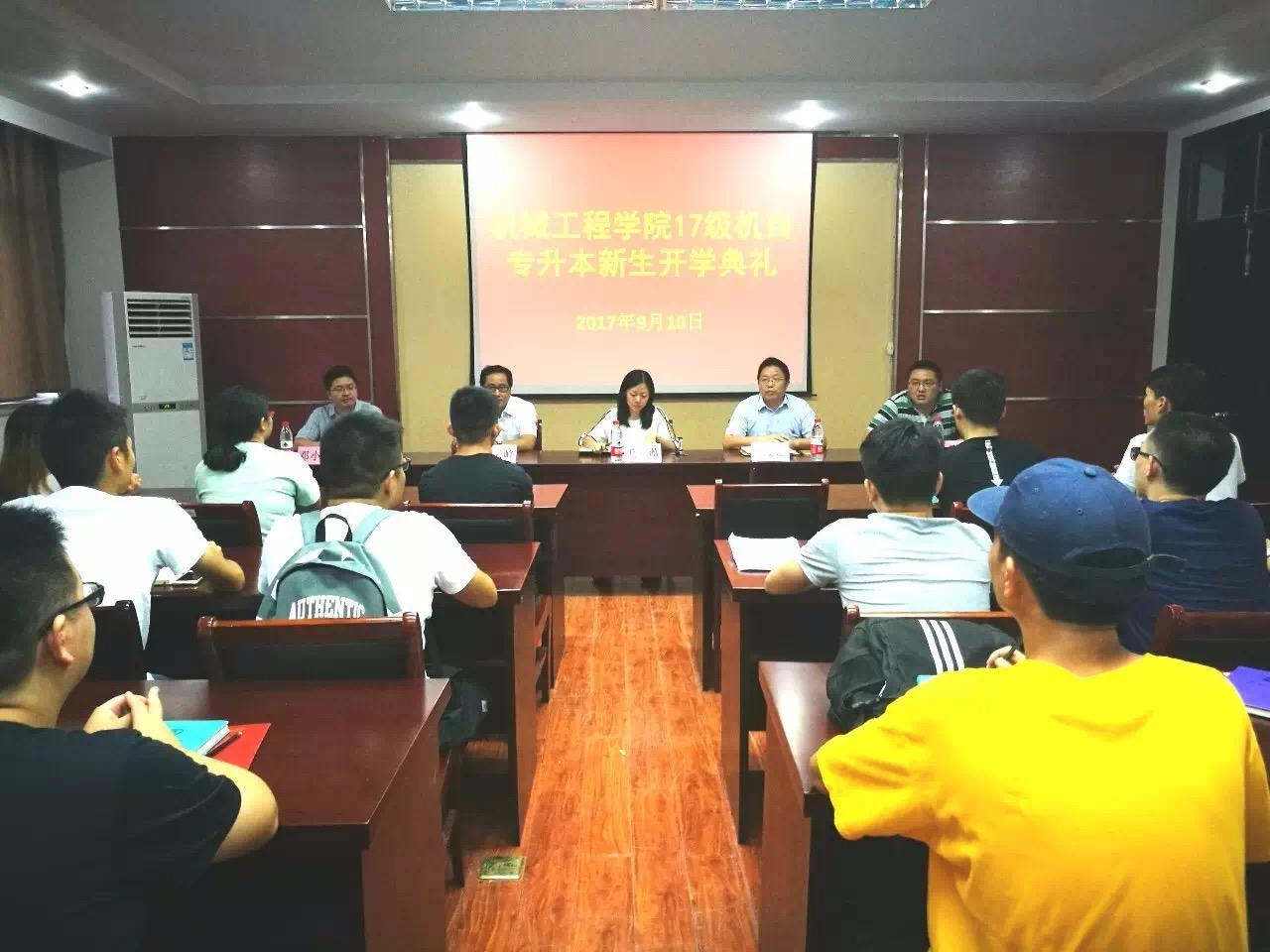 9月10日晚,我院在四号实验楼三楼会议室举行了2017级专升本新生开学典礼。院党总支书记毛薇,副院长肖俊建、副院长黄云峰、副书记马坚及系主任邓小雷一同出席开学典礼。典礼由马坚老师主持。
