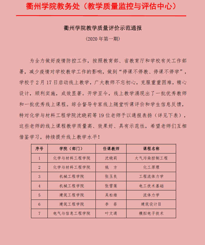 为全力做好疫情防控工作,按照教育部、省教育厅和学校有关工作部署,减少疫情对学校教学工作的影响,做到“停课不停教、停课不停学”,学校于2 月17 日启动线上教学,广大教师不忘初心,克服重重困难,精心设计,顺利实施,成效显著。开学至今,线上教学涌现出了一批优秀教师和一批优秀线上课程。综合督导专家线上随堂听课评价和学生信息反馈,机自系教工党支部党员张玉良等19 位老师予以通报表扬。