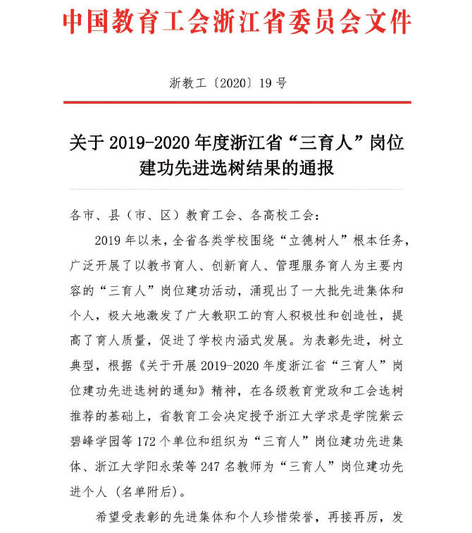 日前,437ccm·必赢国际437ccm·必赢国际机自系教工党支部获得2019-2020年度浙江省“三育人”岗位建功先进集体荣誉称号,这是获批建设全国样板支部以来,取得的又一项重要荣誉。