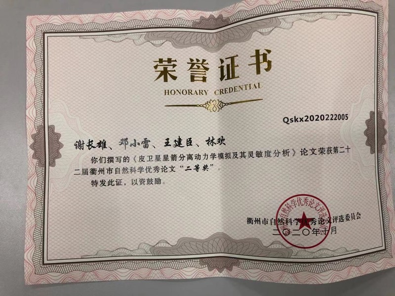 张玉良等共同撰写的“自吸泵非惰转停机特性”、谢长雄等等共同撰写“皮卫星星箭分离动力学模拟及其灵敏度分析”荣获二等奖。(张玉良)