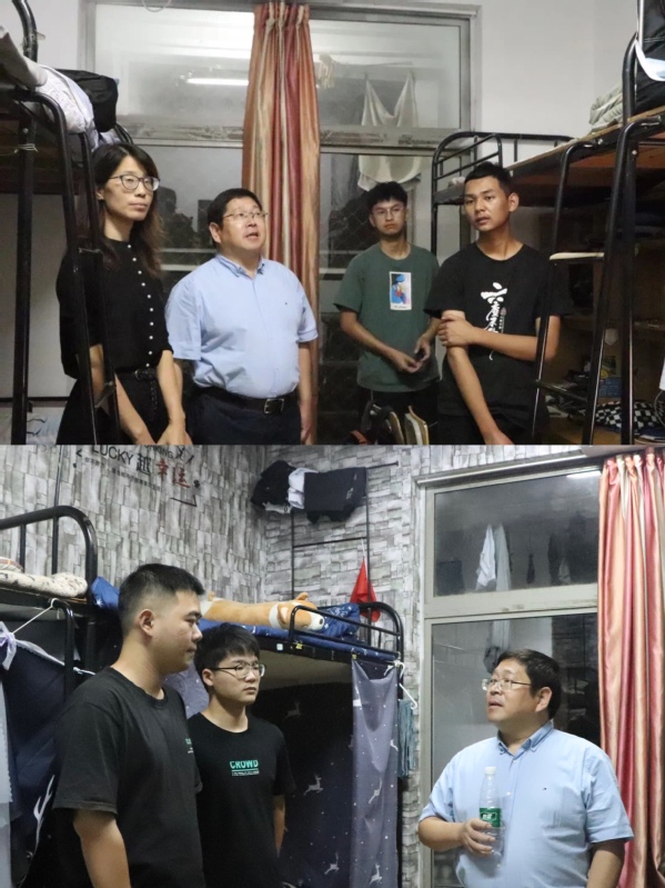 晚上周兆忠副校长、学院班子成员、新生班主任和辅导员走访了新生寝室。和新生交谈过程中,周兆忠期望新生入校要积极参加学科竞赛,学习必须要下苦功夫,付出自己的努力。同事也强调了在大学中学会集体生活的重要性,他鼓励同学们要形成相互关心,相互关怀的良好氛围。