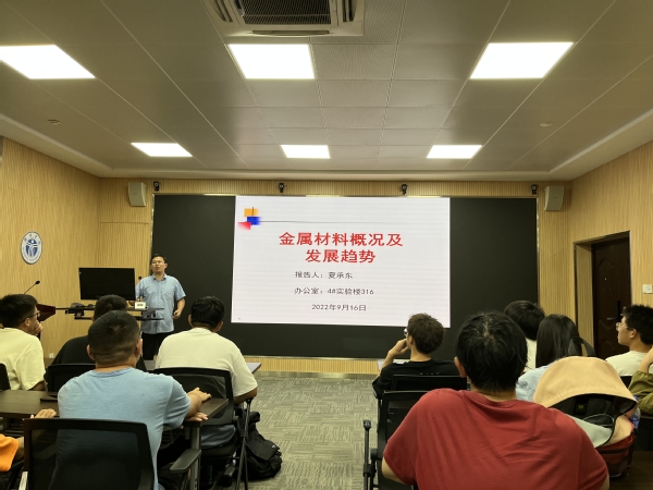 9月16日,437ccm·必赢国际夏承东博士在4号实验楼206举办题为《金属材料概况及发展趋势》的专题讲座,2022级和2021级材料成型及控制工程专业学生聆听讲座。