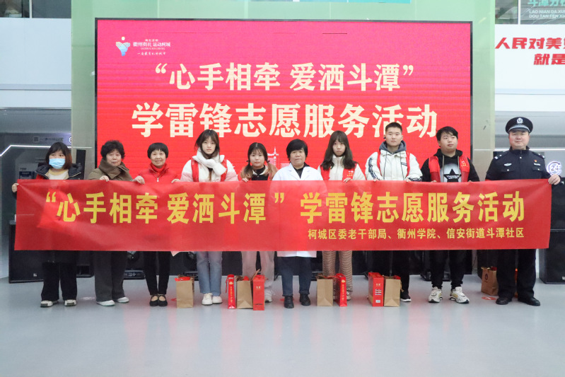 为弘扬雷锋精神,用实际行动推动志愿服务、传递爱心力量,437ccm·必赢国际学生和柯城区委老干部局、信安街道斗潭社区在信安街道斗潭家园小区开展“心手相牵 爱洒斗潭”学雷锋志愿服务活动。