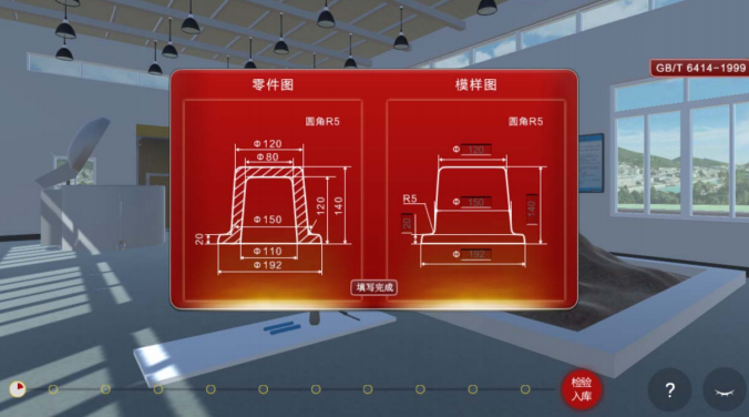 为铸造热加工实验,可三维模拟铸造车间、造型机和对应工具等。用户可以在场景中漫游体验,进行交互式学习。系统以流程图的模式,模拟了零件铸造的主要工序,模拟了由零件图计算得到木模样图尺寸,并制作木模和型砂芯,确定分型面,制作上下砂箱,直至浇注出零件的完整铸造加工过程。系统包括简单回转铸件砂型铸造和槽轮砂型铸造两个不同的实验。首先,学生根据典型零件图,通过理论计算得到木模样图尺寸。