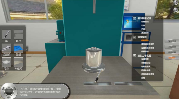 本虚拟实验提供钣金铆接的实验介绍、实验原理、部件认知和实验操作等四个部分的内容介绍,模拟了钣金铆接的完整实验流程,其中实验操作包括制作铆接试样,进行铆接实验,钣金接头剪切、拉伸等力学实验。首先进行板材划线操作,板材切割操作;然后用纱布清洁板料,对板料进行划线操作,进行铆接操作,两块板料铆接成型,最后对铆接板料进行力--位移测试(对铆接部位施加剪切应力进行测试),生成力--位移曲线。 |
